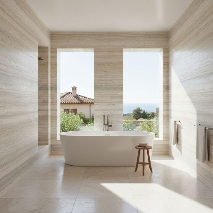 The Roman Ocean finish is produced by combining traditional Roman travertine with ocean-inspired wave patterns. This creates a refined surface that captures the rhythm of water movement while maintaining the stone’s natural warmth and character.